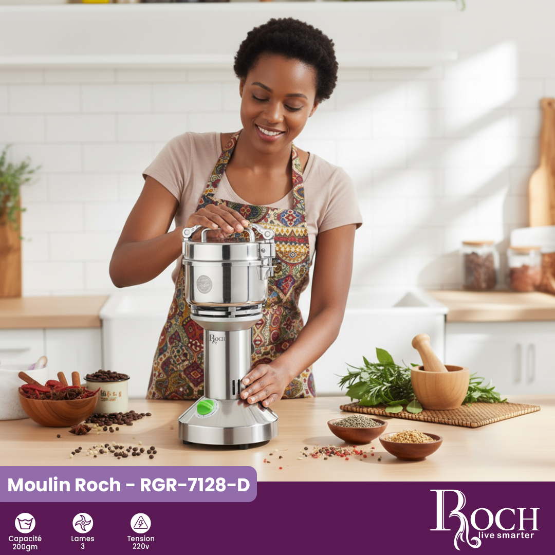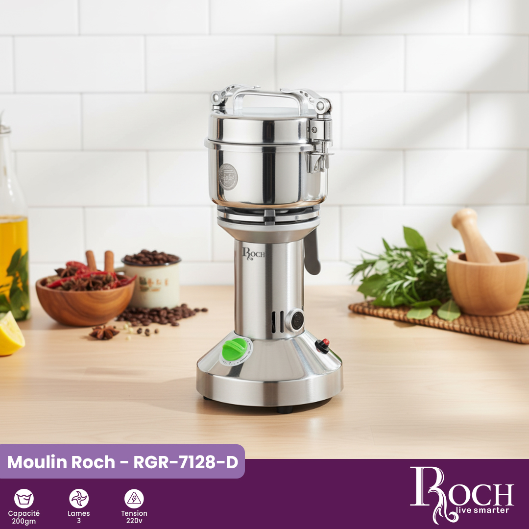 Son moteur de 1 180 W assure une puissance remarquable, capable d’atteindre une vitesse de 28 000 tours par minute (RPM) pour obtenir une mouture fine et homogène en quelques secondes. Fonctionnant sous une tension de 220V, le ROCH RGR-7128-D garantit stabilité, sécurité et efficacité énergétique.