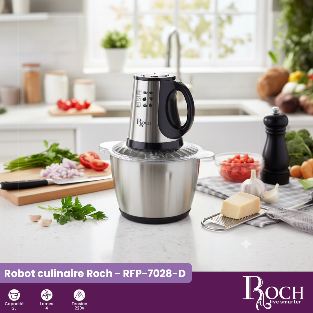 Le robot culinaire ROCH RFP-7028-D est un appareil polyvalent et puissant, conçu pour simplifier toutes vos préparations en cuisine. Avec une capacité de 3,1 L, il vous permet de réaliser facilement vos recettes préférées, qu’il s’agisse de hacher, mélanger, râper, émincer ou pétrir. Idéal pour les familles et les passionnés de cuisine, il combine efficacité, robustesse et élégance dans un design compact et moderne.